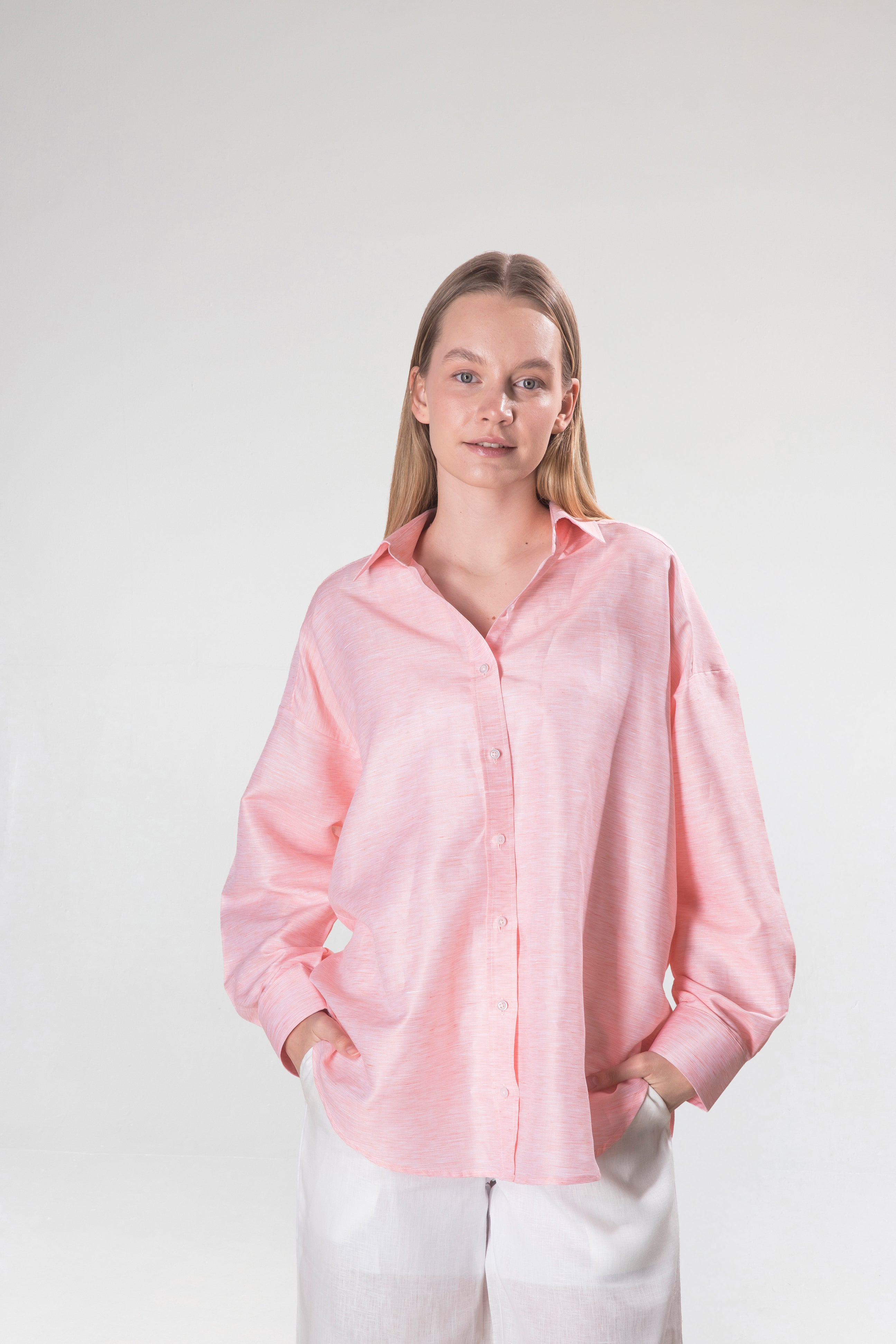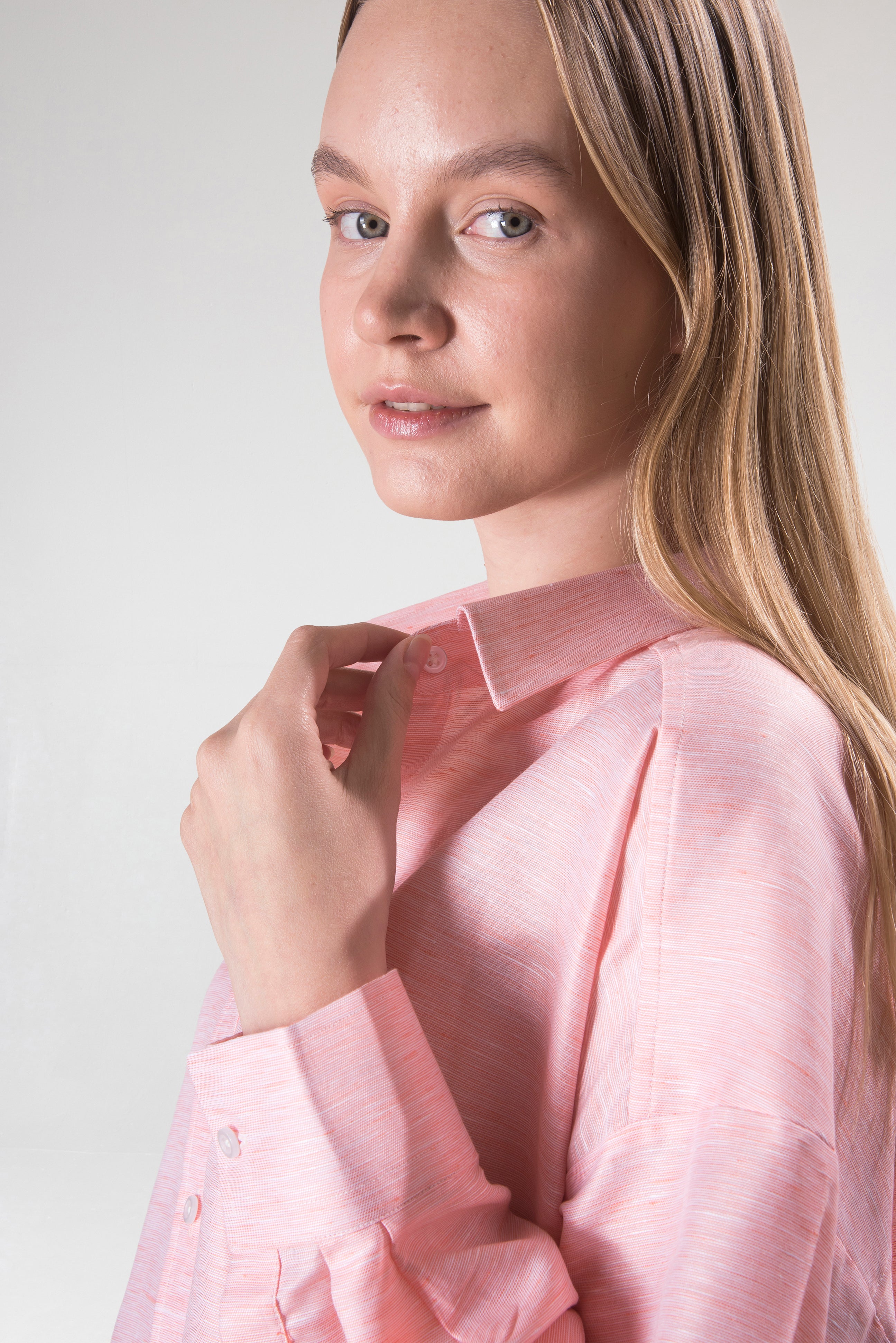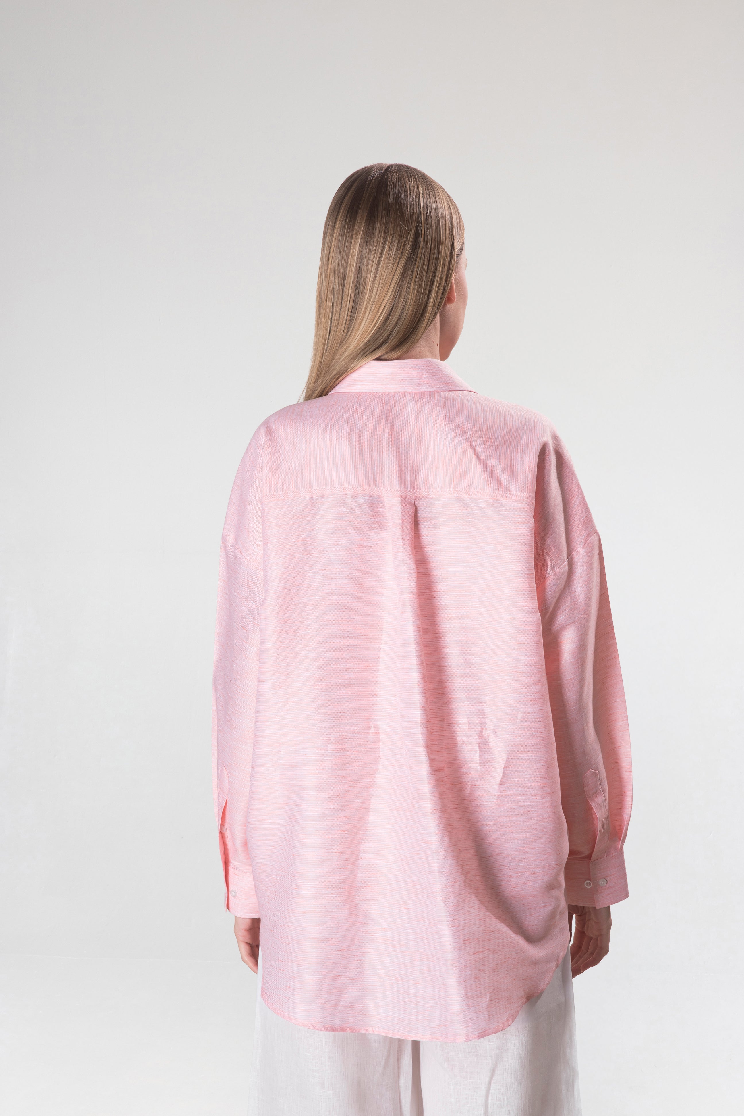 Doğal keten dokusu ve sade pembe tonu ile gün ışığını üzerinde taşıyan bir gömlek. Hafifliği, ölçülü kesimi ve zamansız duruşuyla yaz koleksiyonunun öne çıkan parçası.